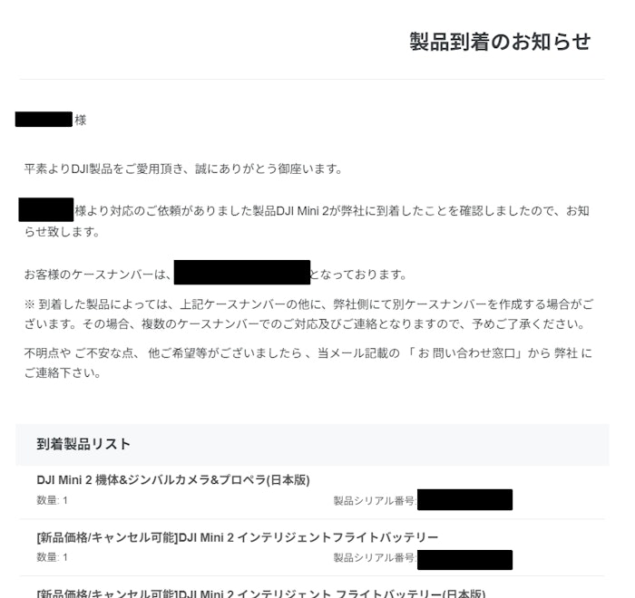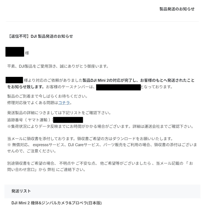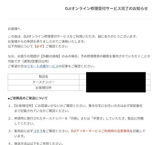 依頼するとメールが届く、メールにはケースナンバーが記載されており、このメールを印刷するか別の紙に手書きで書いて、故障した機体を付属品も含めて全部送ってください。との事だった。
