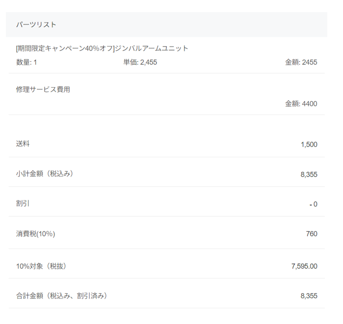 さて気になる修理費用だが、交換部品が40%引きで2455円、サービス料が4400円、送料1500円と消費税で合計8355円となった。思った以上に安い。交換部品の割引キャンペーンって何なんだろう・・・。
